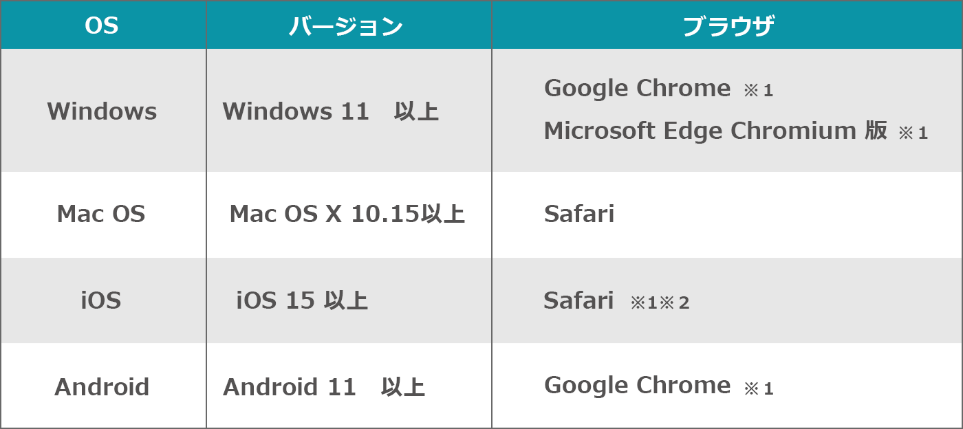 ・表の要件を満たさない機器の一例として「Chromebook(ChromeOS)」が該当しますので、ご注意ください。