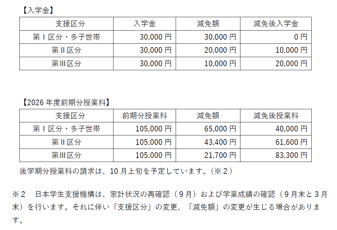 ※3 「初回の給付奨学金及び入学金・前学期授業料の減免額の還付」以降は、定期的に行われる日本学生支援機構の家計状況の再確認(9月)および学業成績の確認(9月末と3月末)により、「支援区分」の変更、「減免額」の変更が生じる場合があります。