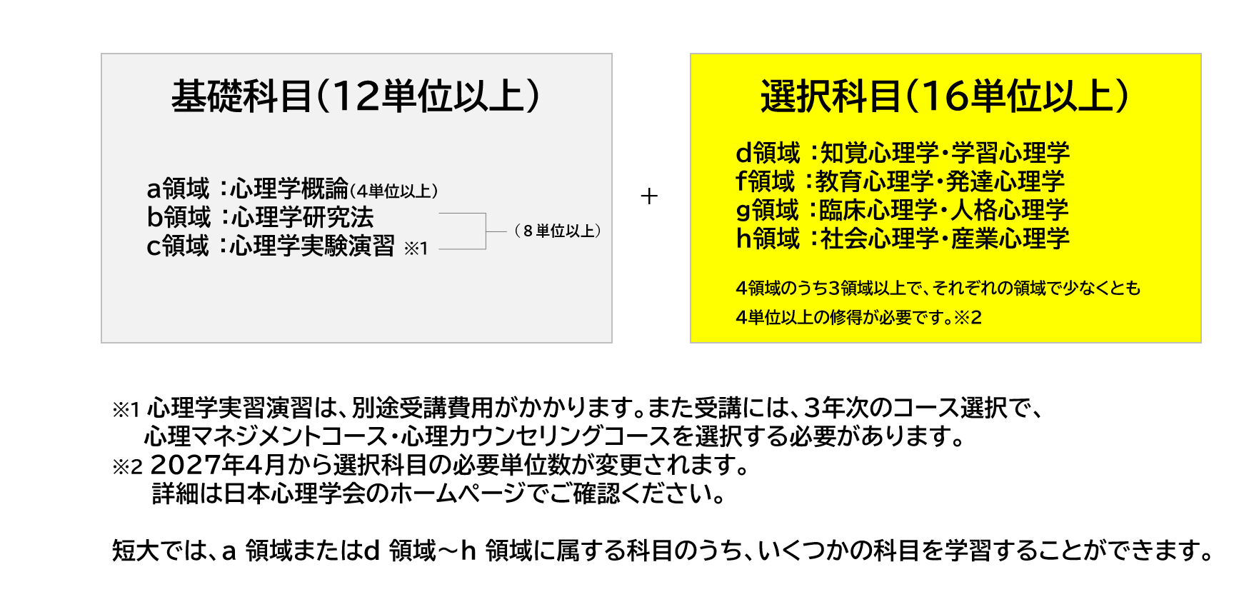 ※短大では心理学基礎コースまたは健康福祉マネジメントコースにて認定心理士取得に必要な科目が配本されますが、
