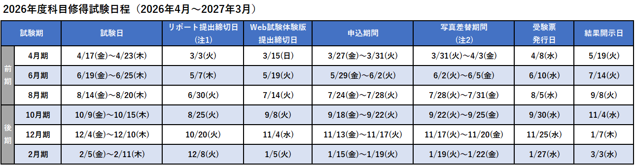 (例:2027年度の科目修得試験日程は2026年中(~2026/12/31)に発表されます)