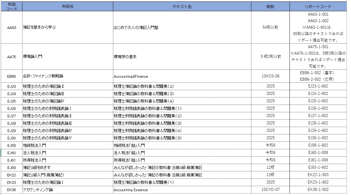 下表のテキストについては、2025年4月以降実施する科目修得試験、リポート添削、スクーリングは対応しません。