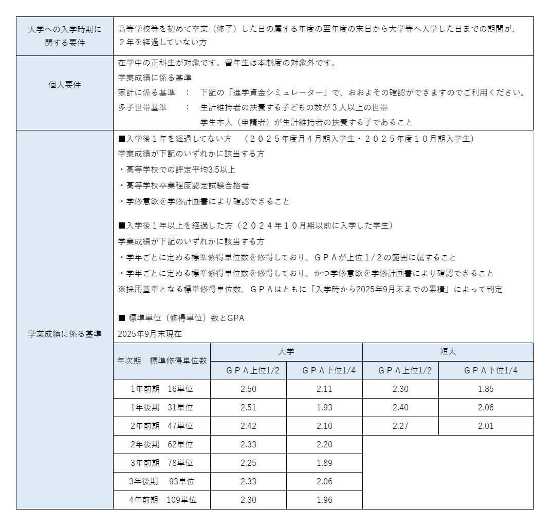 ★2025年在学生用 給付奨学金案内pdf の6ページ 3-(1)大学等への入学時期に等に関する要件をご確認ください。