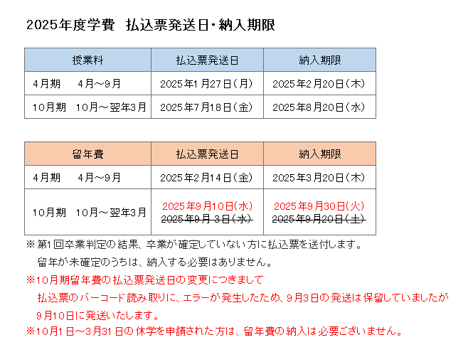 学費納入案内(払込票付き)は、第1回卒業判定の結果、卒業が確定していない方に、大学・短大ともに送付します。