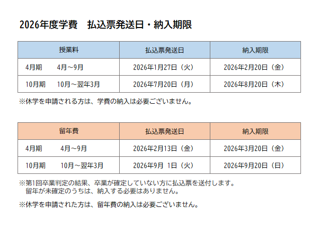 学費 払込票発送日・納入期限