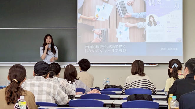 「計画的偶発性理論」とは、予期せぬ出来事をチャンスと捉え、それをキャリア形成に活かしていくという考え方です。宮本先生は、JR北海道広報、人材開発コンサルタント、フリーアナウンサーなど多彩なキャリアを経て、現在は産業カウンセラーとして活躍されています。