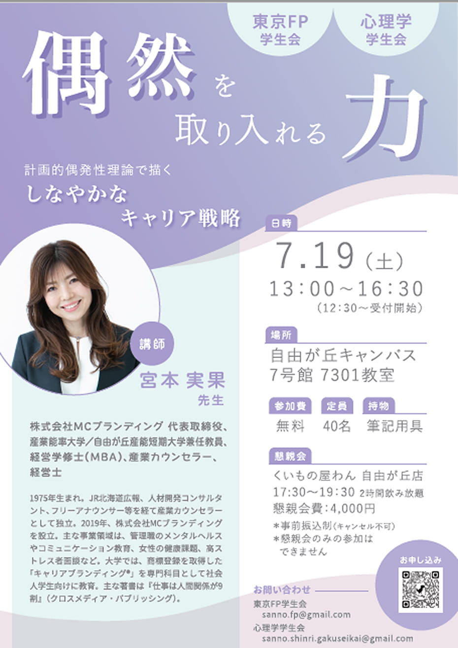 2025年7月19日(土)、東京FP学生会と心理学学生会の共催による「心理学セミナー」が開催されました。講師には、通学スクーリング科目「キャリアブランディング」を担当されている宮本実果先生をお迎えし、心理学の理論「計画的偶発性理論」についてご講義いただきました。