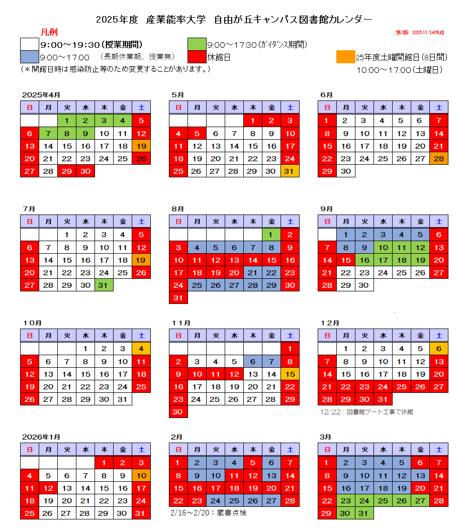 印刷用 2025年度図書館カレンダー 自由が丘キャンパス(165KB)
